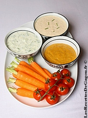 Préparez vos crudités après les sauces qui se conservent quelques heures au réfrigérateur. Sortez les trois bols de sauce au moment de servir pour que cela reste très frais. Vous pouvez également répartir les sauces dans de petits bols individuels.