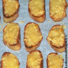 - Disposez les tranches de pain sur la plaque recouverte de papier sulfurisé et placez-les au four sous le grill. Une fois dorés sortez la plaque, retournez les croûtons et répartissez sur chacun d'eux une cuillérée à café de comté. Remettez au four pour laisser dorer le fromage.
